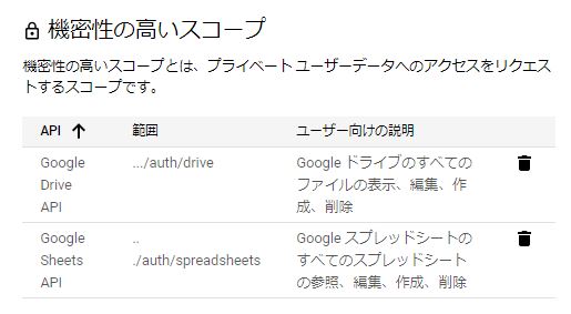 スコープを追加または削除ボタンをクリックするとAPIの一覧が表示されます。