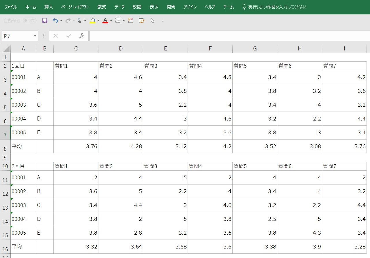 レーダーチャートは対象者1人ごとに1個作成するので、2回分の結果とそれぞれの平均も載せるように作成します。